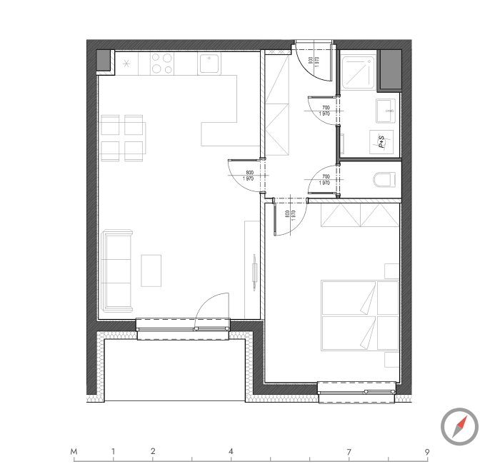 POZNÁMKA: Plochy jednotlivých místností jsou pouze orientační s toleranci +/- 3%. Vyobrazené zařízení (kuchyňská linka, el. spotřebiče, vestavěné skříně, nábytek, apod.) není součástí vybavení bytu.